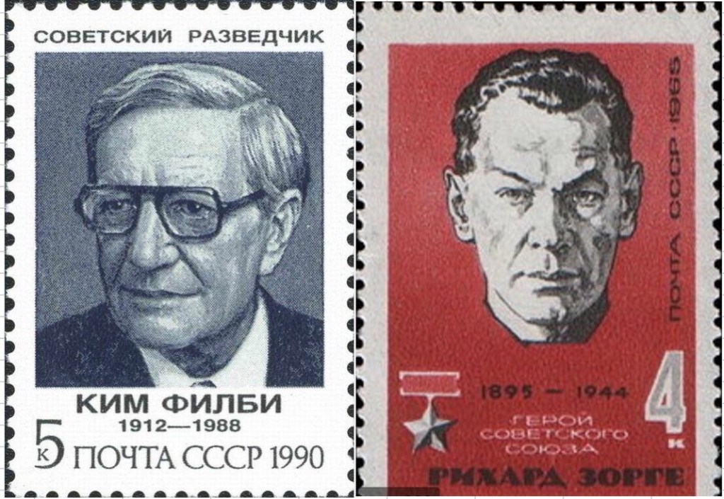 Murray Sayle, journalist voor de Sunday Times die Philby interviewde na zijn bekentenis dat hij dubbelspion was ten voordele van de USSR merkte de overeenkomsten op tussen beide spionnen: beiden waren journalist, kinderen van expatouders en als jongvolwassene in de ban geraakt van het communisme. Het mechanisme schijnt bij beiden vrijwel hetzelfde geweest te zijn: na de constatering dat alcohol onmiddellijke vriendschap betekent, en een bar de ideale plaats is om informatie los te krijgen – en de ontdekking, die veel dronkaards hebben gedaan, dat drank directe verlichting van knagende angst biedt – gingen de twee spionnen aandacht trekken met hun gedrag in de veronderstelling dat niemand zou denken dat openlijk vertoon een vorm van camouflage is. Beide spionnen kregen als eerbetoon een postzegel in de Sovjet-unie. Philby in 1990. Sorge in 1965.